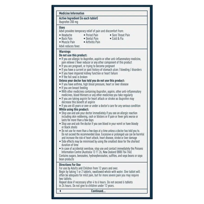 Advil Tablets provide effective pain relief at great everyday value. Each Advil Tablet contains 200mg ibuprofen and is a round, sugar coated tablet that is easy to swallow. Use Advil Tablets for temporary relief of pain and discomfort from everyday pains and aches. Advil Tablets also reduce fever.