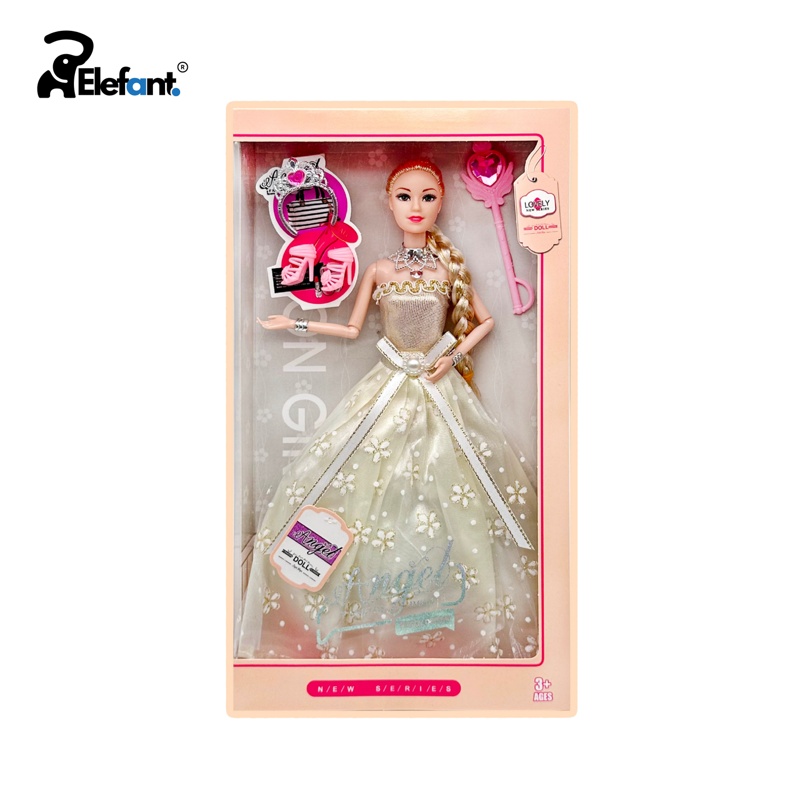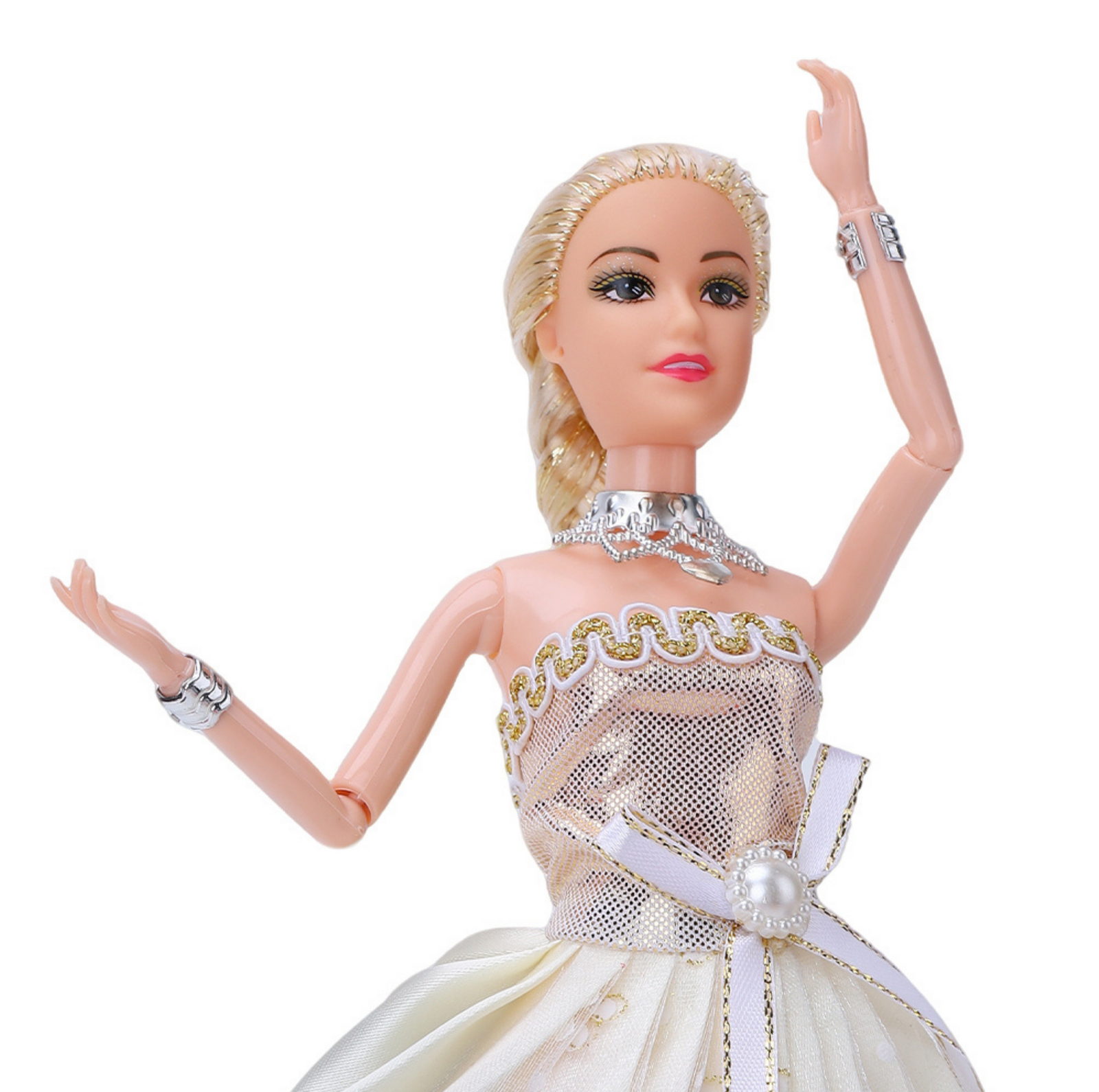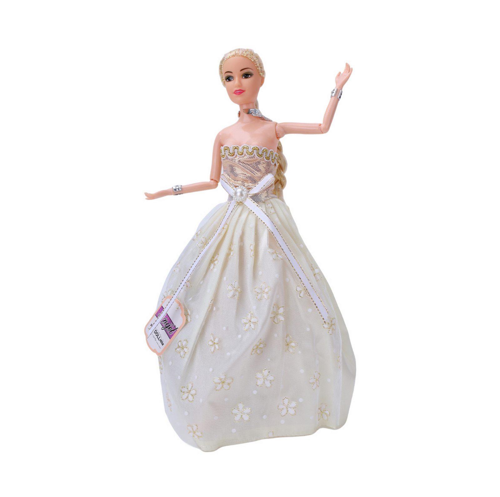 • Elegant Gown Design – Comes dressed in a shimmering ball gown with intricate details.