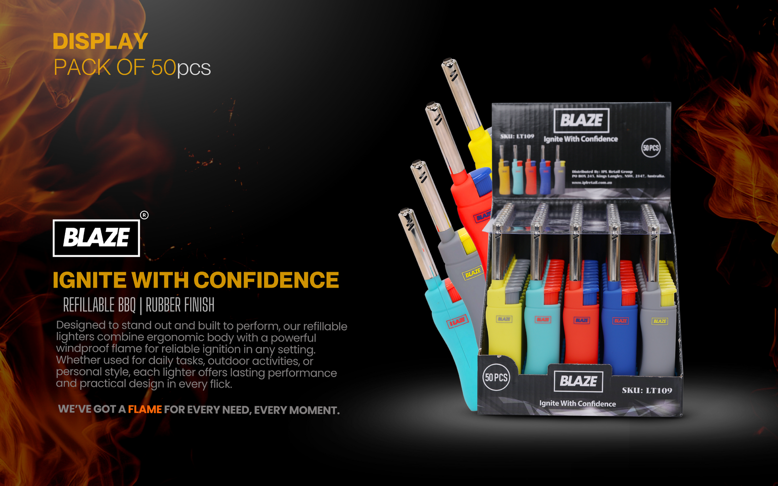 Never let wind or weather get in the way of a great BBQ again with the BBQ Torch Pro by BLAZE. This 50-piece pack of refillable utility lighters is designed for outdoor power and precision. Featuring a long nozzle for safe ignition and a windproof flame for reliable performance, it’s the go-to tool for lighting grills, fire pits, stoves, and more. Rugged, refillable, and comfortable to use, it’s built for every outdoor enthusiast and backyard chef.