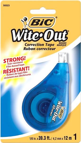 Fix mistakes instantly with the BIC Wite-Out® Correction Tape, the reliable correction solution for school, office, or home use. This tear-resistant, film-based tape applies dry, so you can write over it immediately—no waiting, no smudging, no mess.