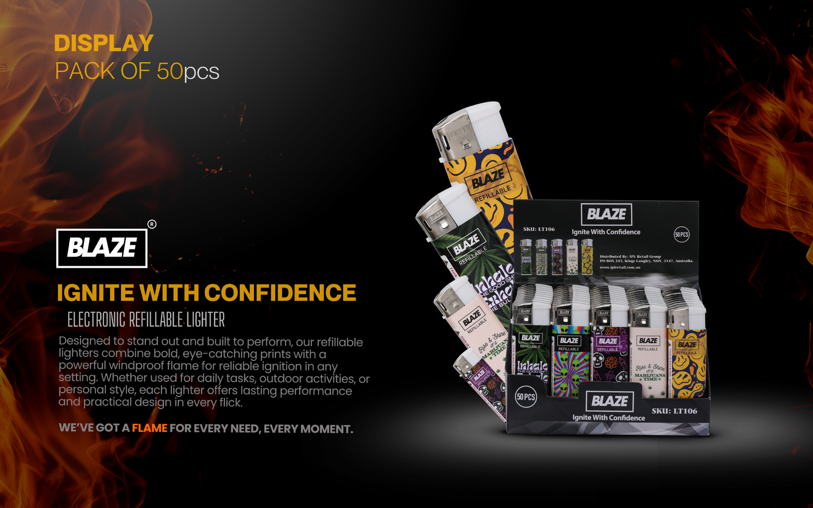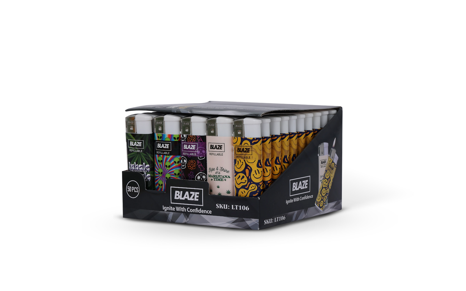 • 50-Piece Pack: A colourful collection of eye-catching lighters in a retail-ready display box.