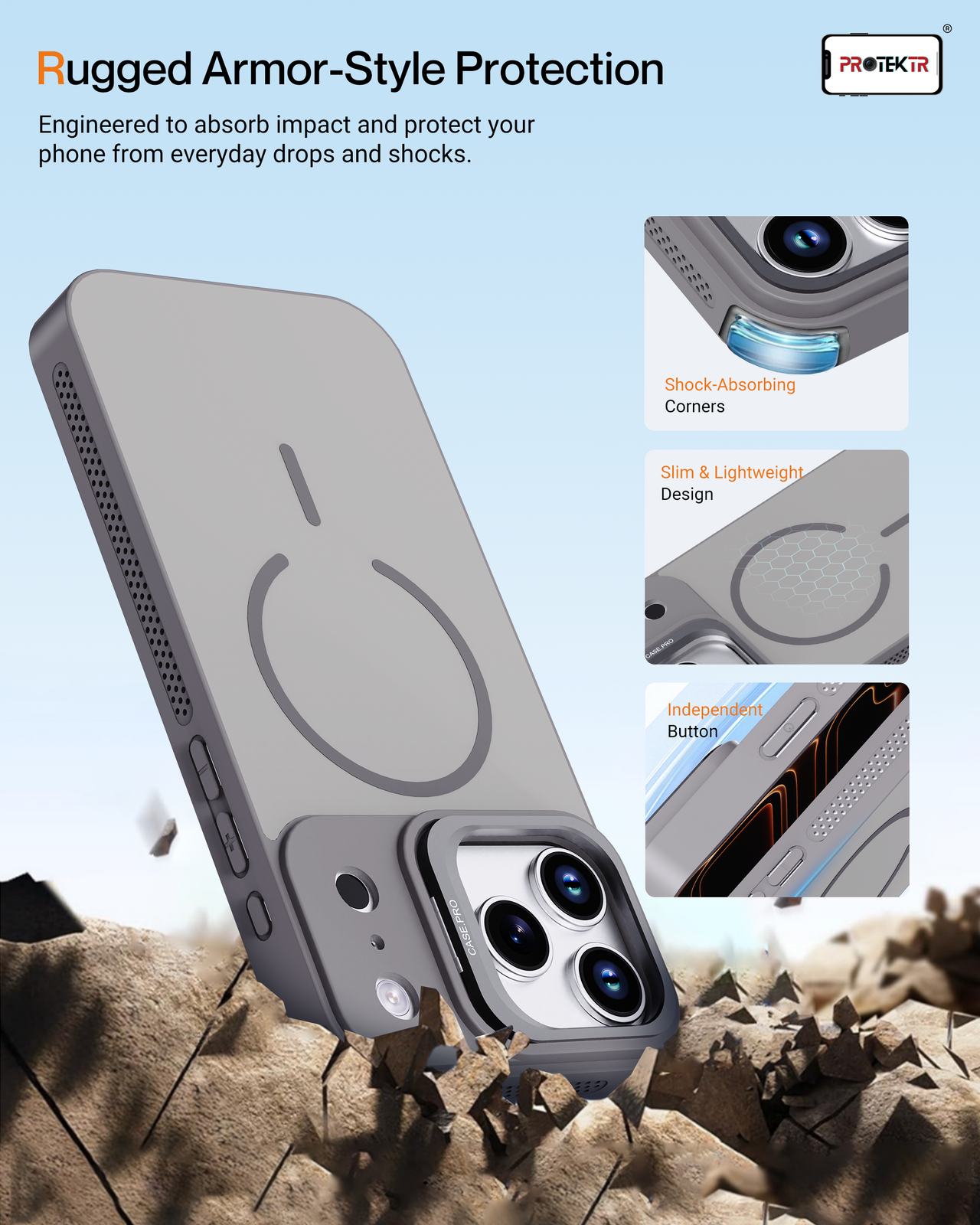 Crafted with durable hybrid materials and a smooth finish, engineered for everyday protection and a comfortable grip. The metal camera bracket enhances durability while offering practical kickstand functionality.