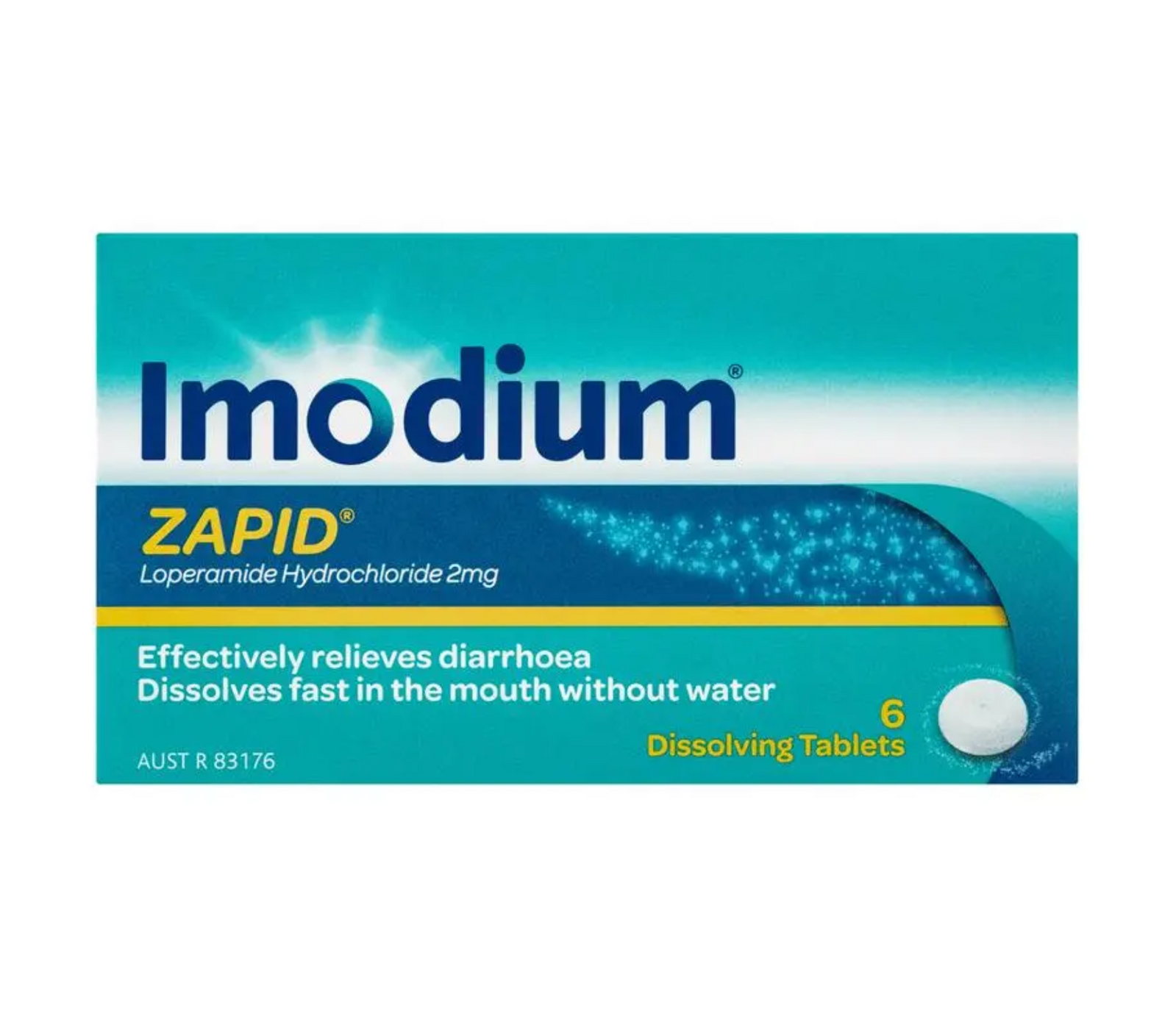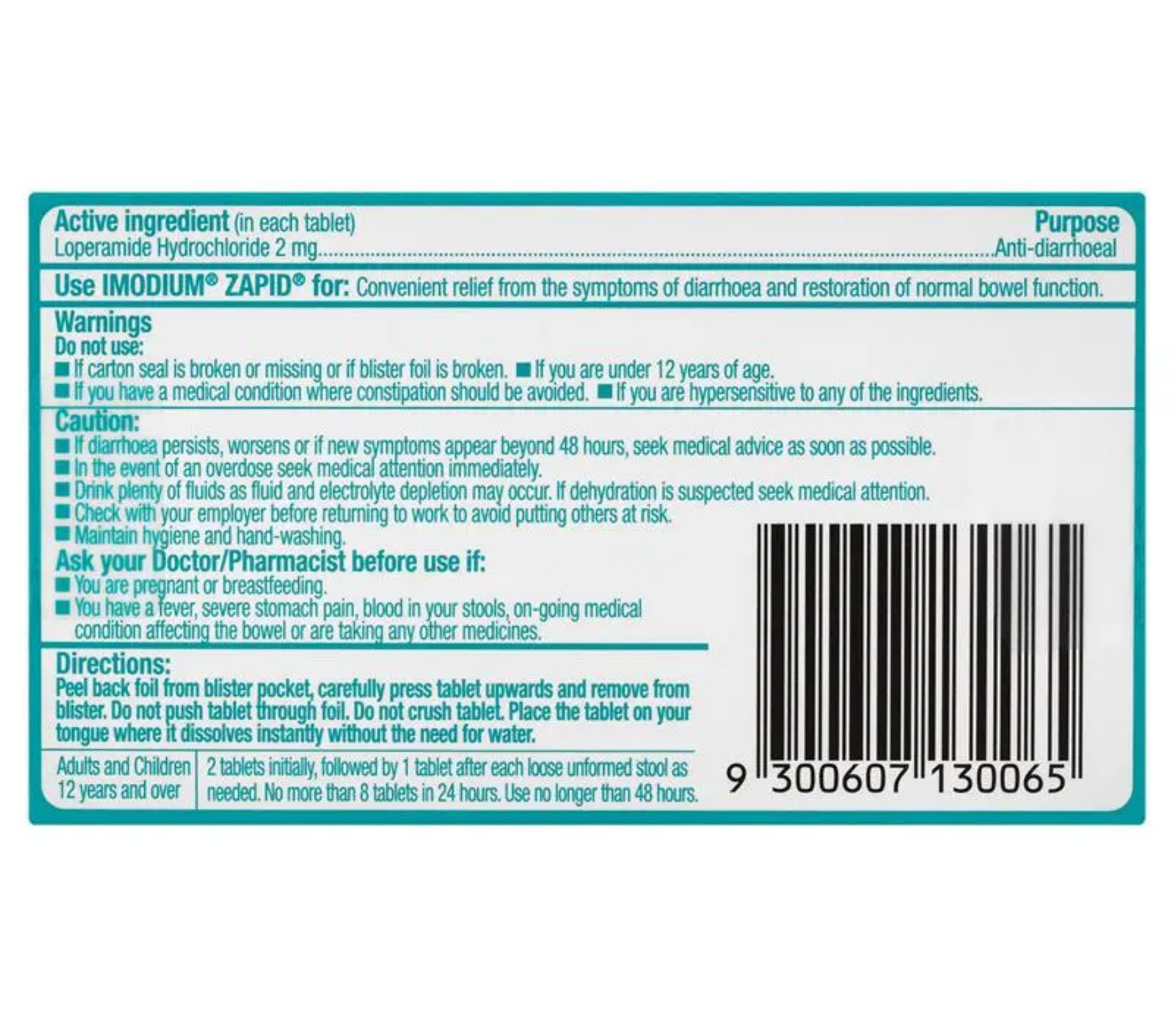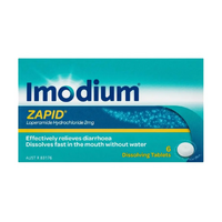 • Imodium Zapid Dissolving Tablets effectively relieve diarrhoea and dissolve quickly in the mouth without water - perfect for on the go.