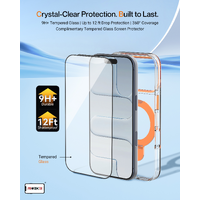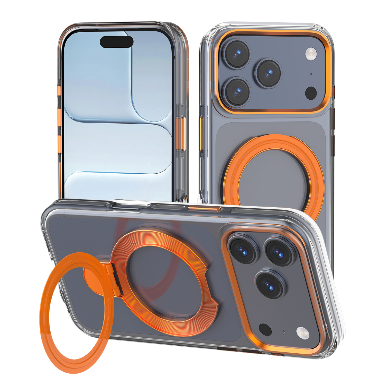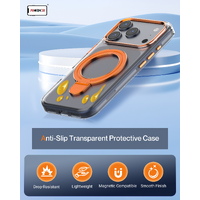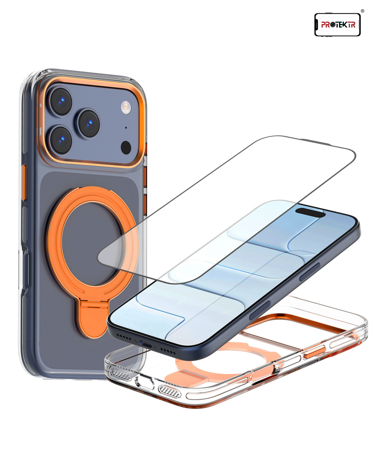 Add a bold touch of protection to your device with the PROTEKTR Ion Orange Pro Case. Featuring a transparent body with vibrant orange accents, this case combines modern design with practical functionality. The integrated metal ring holder provides a comfortable grip and transforms into a convenient stand while maintaining MagSafe compatibility.