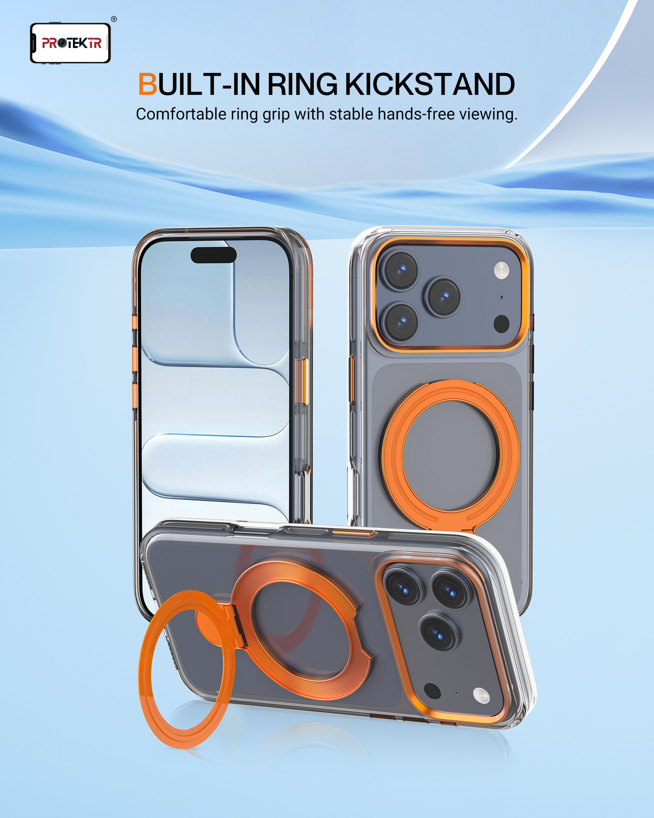 Crafted with a smooth clear finish and reinforced frame, complemented by a durable metal ring stand designed for magnetic support, grip stability and everyday reliability.