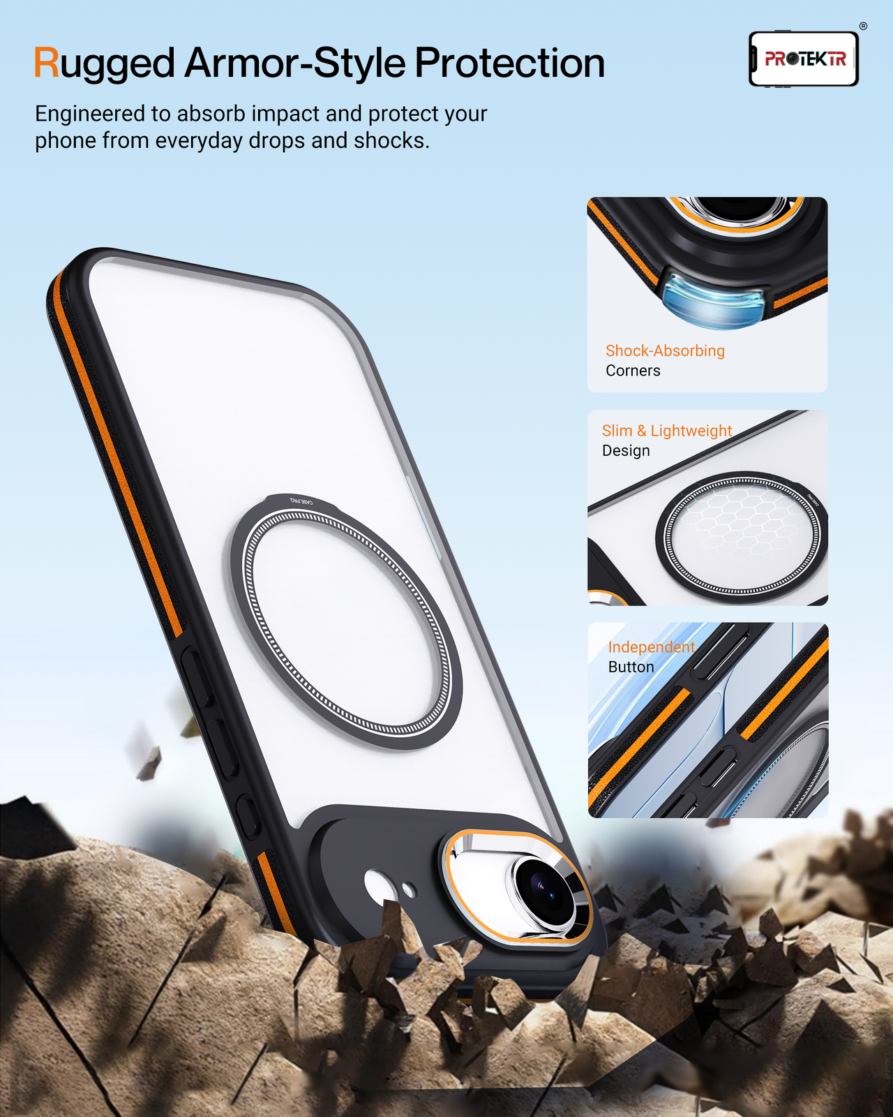 Enhance the look of your device while keeping it protected with the PROTEKTR Midnight Dual-Color Air Case, designed specifically for the iPhone Air. This case features a transparent back panel combined with a sleek black frame and subtle orange accent lines, delivering a modern dual-colour design that balances style and protection.