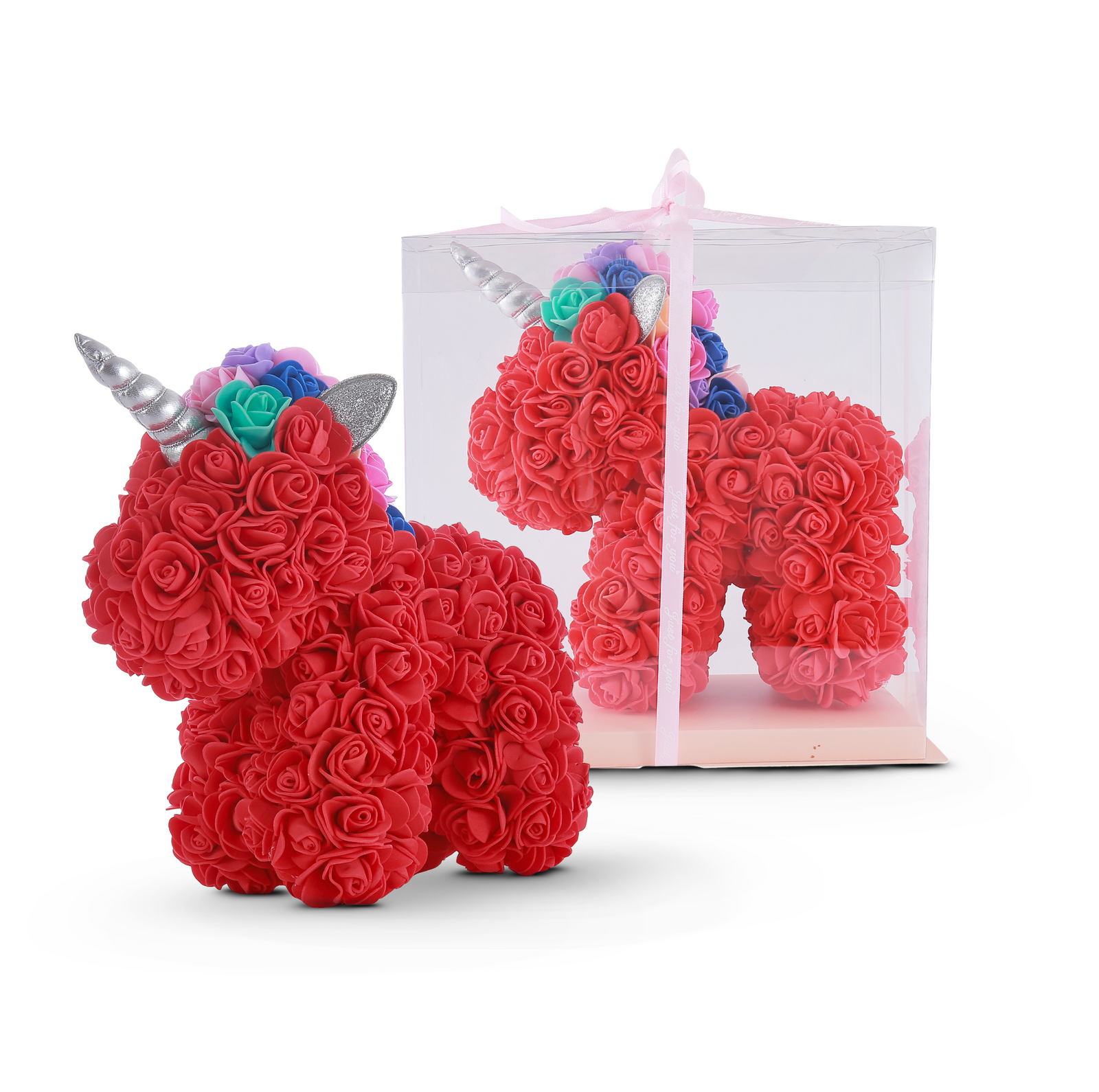 Bring a touch of magic to your décor with the Rose Dream Unicorn — a beautifully handcrafted piece made entirely of delicate artificial roses. Its soft pastel tones and charming unicorn shape make it a perfect gift or centrepiece for any occasion.
