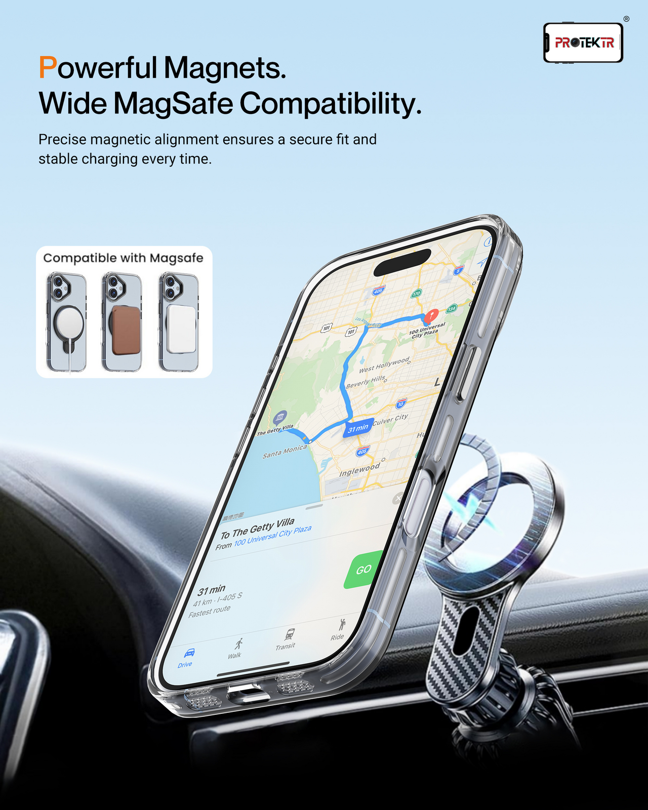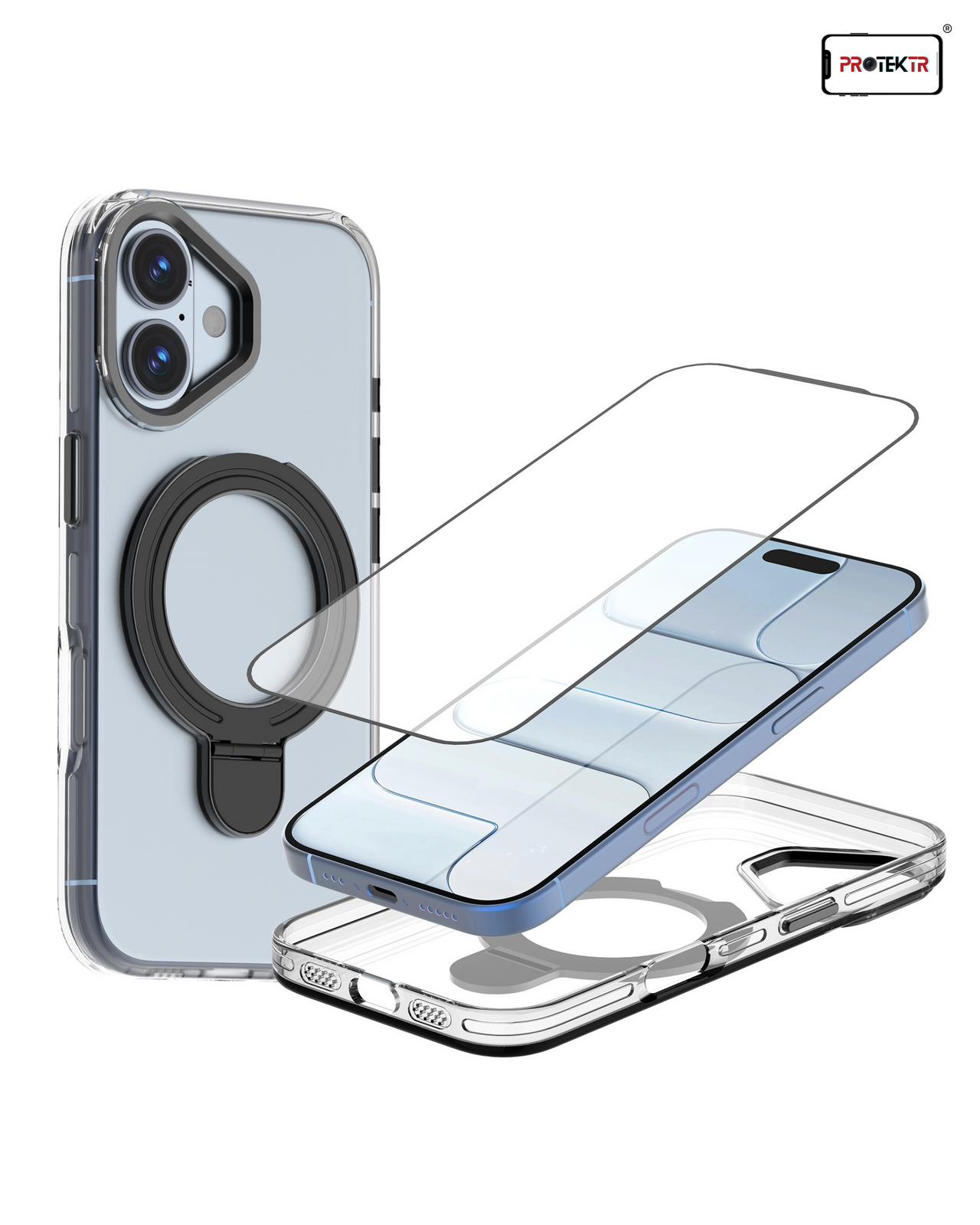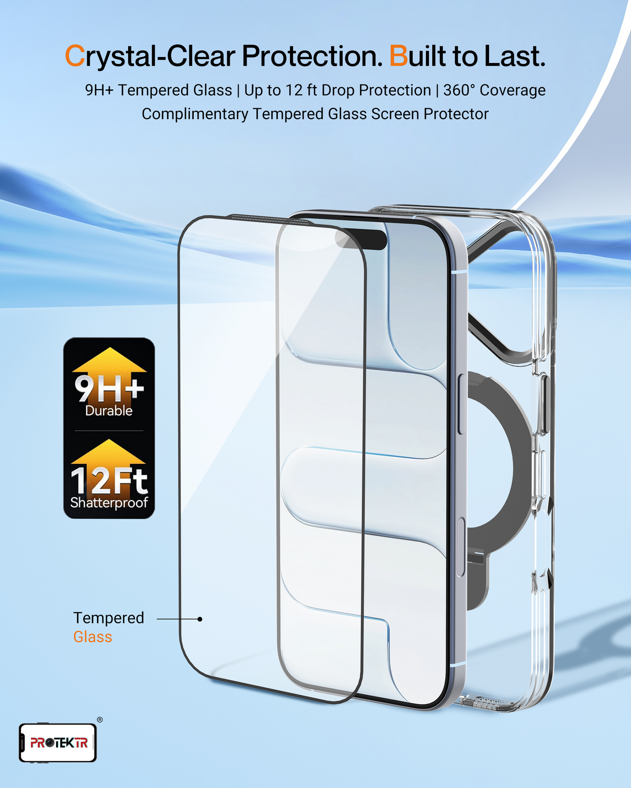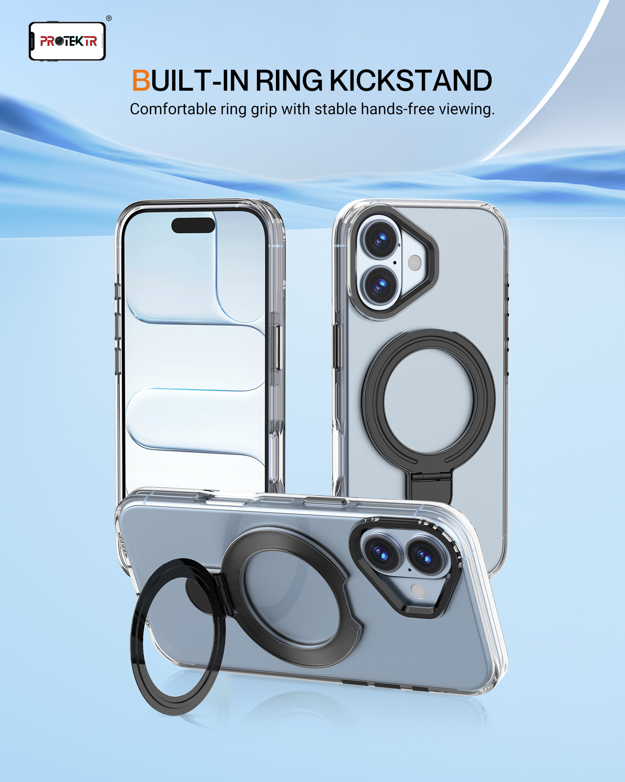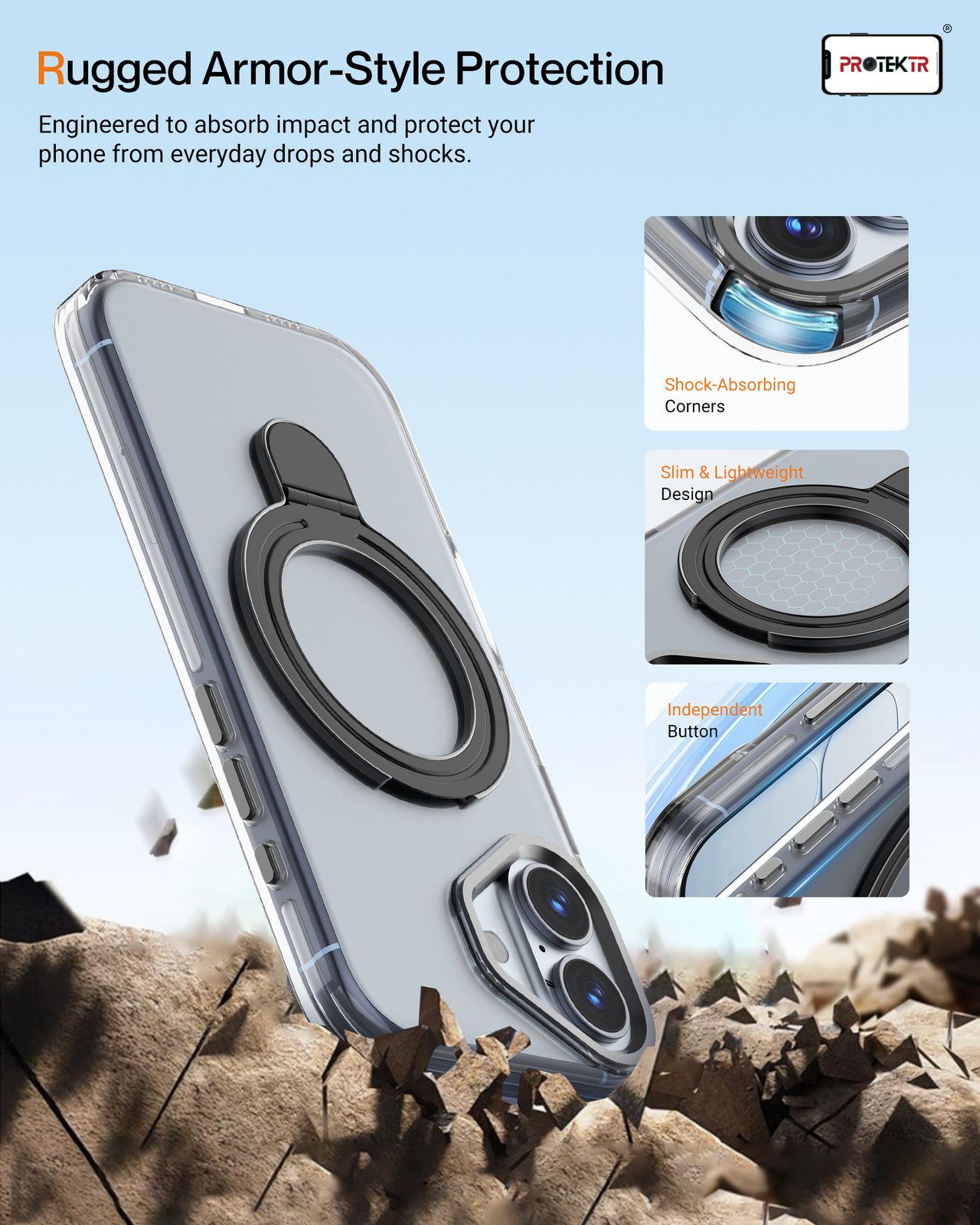 Show off your iPhone while keeping it protected with the PROTEKTR ShadowClear Pro Case. Designed with a crystal-clear back and a built-in metal ring stand, this case combines style, functionality, and reliable protection. The integrated magnetic ring supports MagSafe accessories while doubling as a convenient grip and stand.