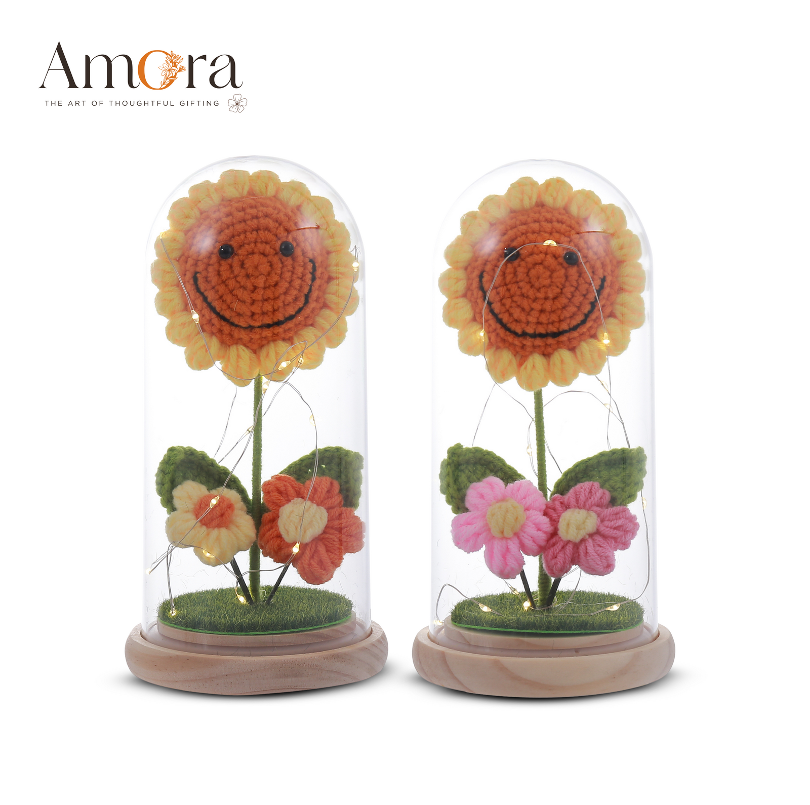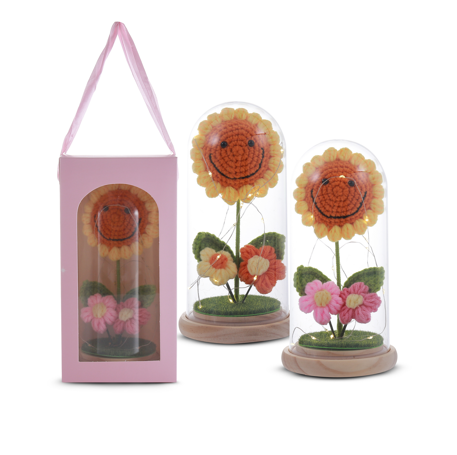 • Charming Design – A crochet sunflower with a smiling face and delicate pink flowers at the base.