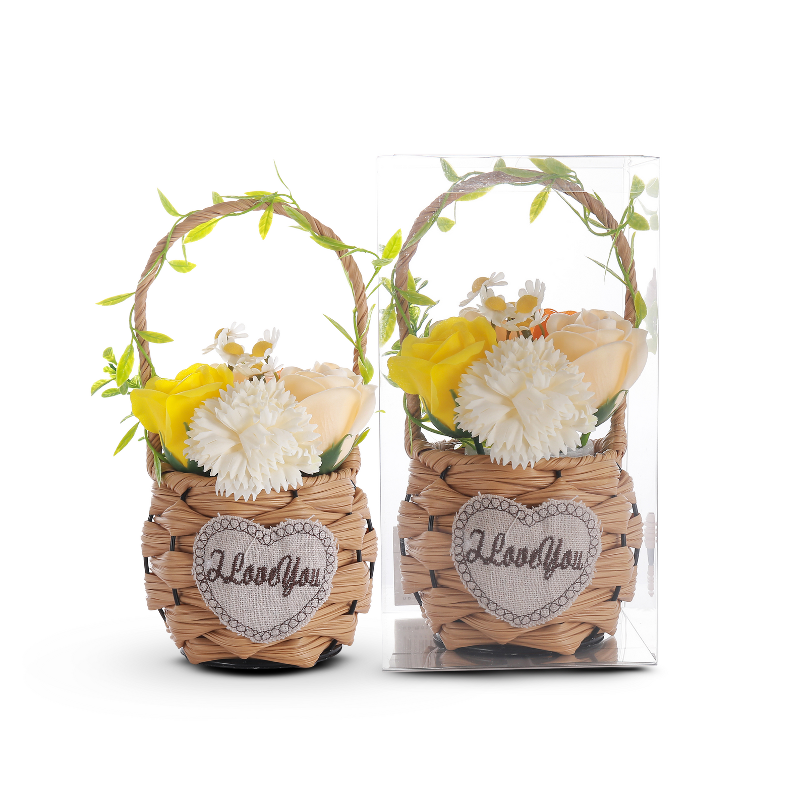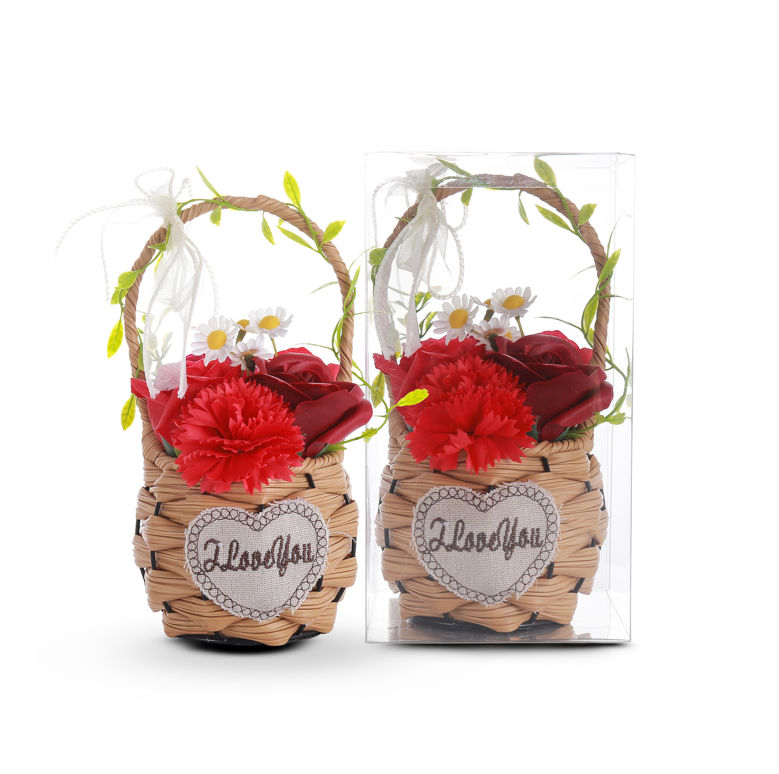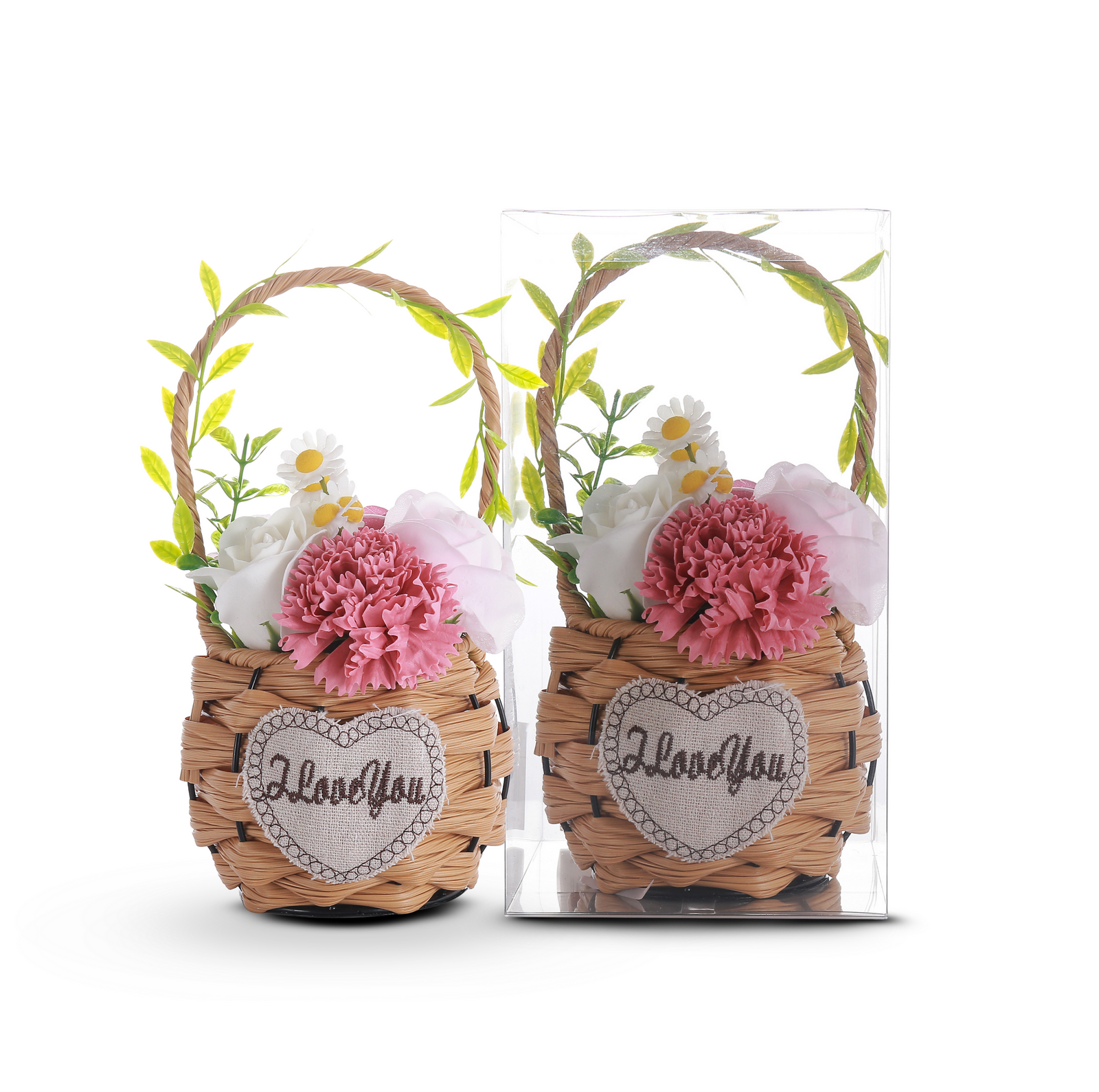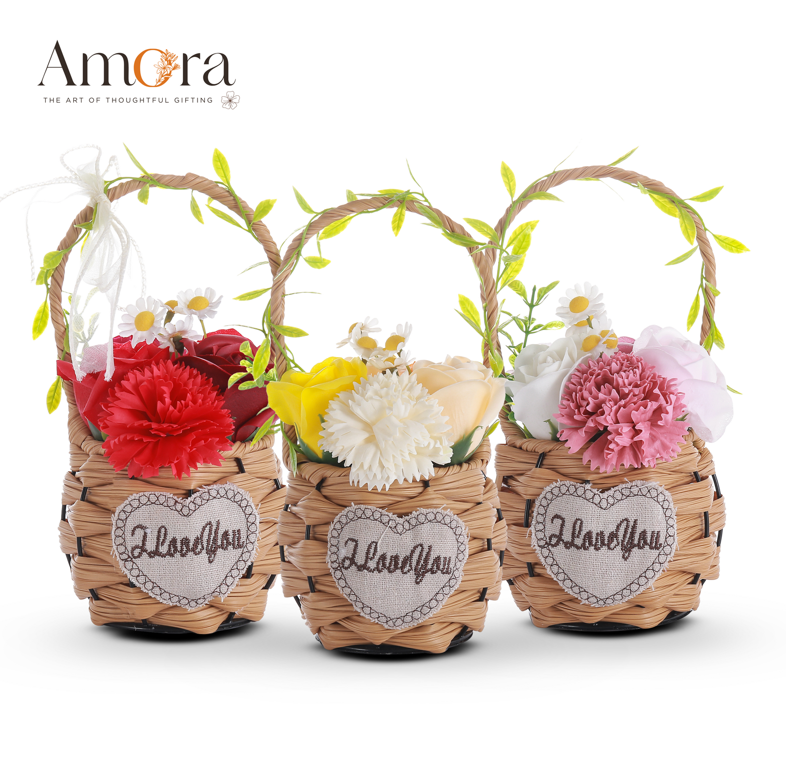 • "I Love You" Basket with Ribbon & Greenery – A thoughtful woven basket with a "I Love You" message, entwined with lush green leaves and a cute ribbon detail.