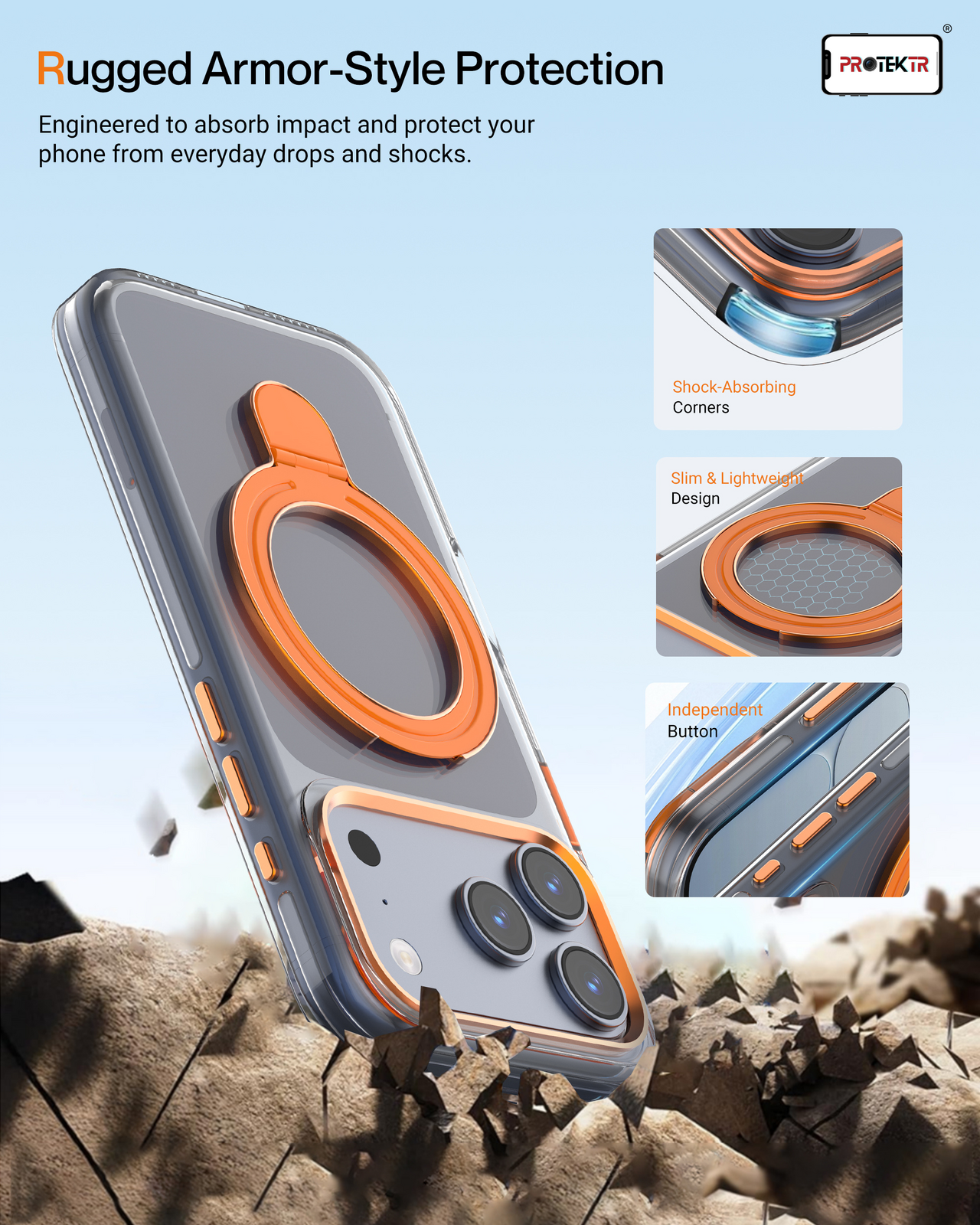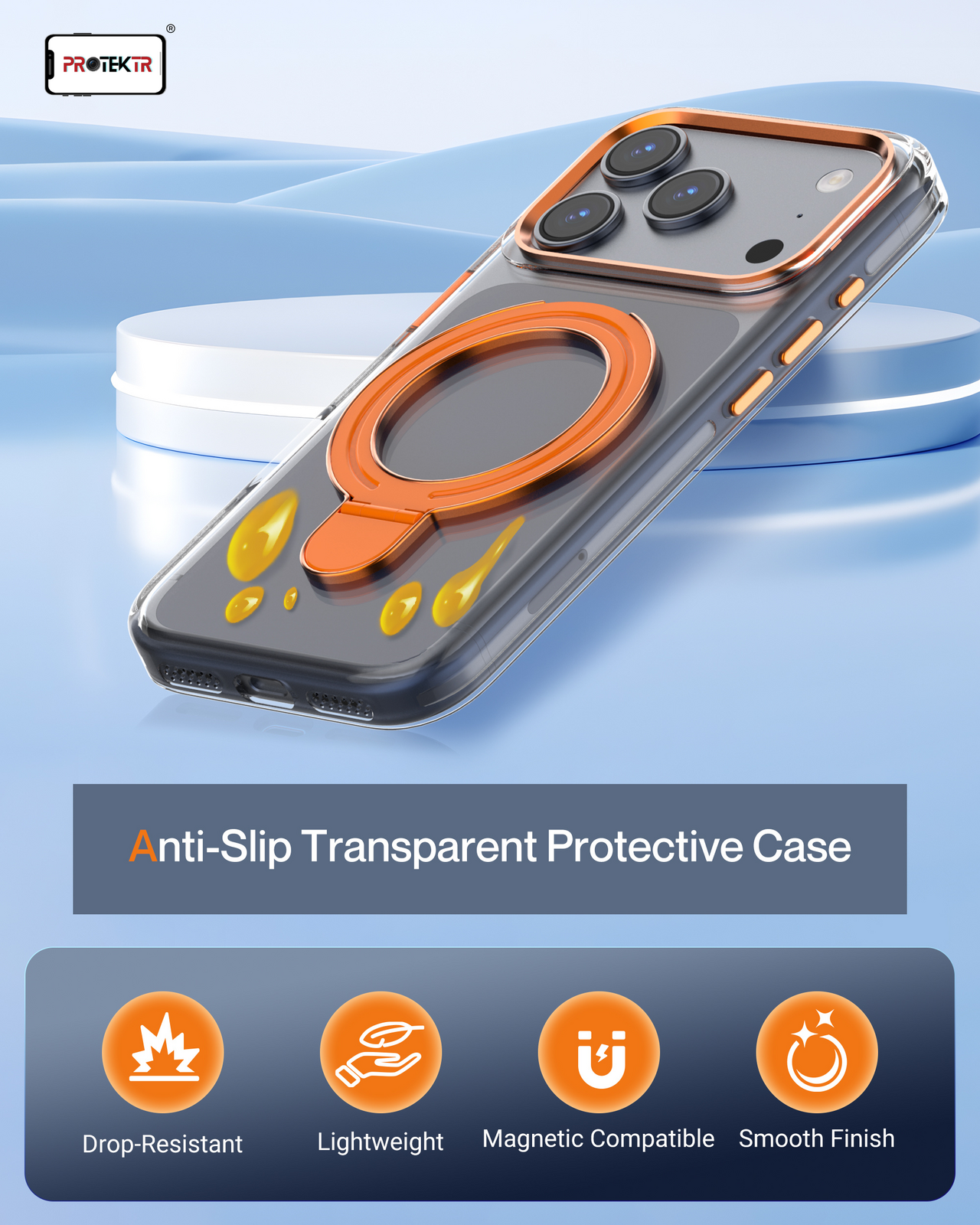 Bring style and practicality together with the PROTEKTR Tangerine Clear Case, designed to keep your iPhone protected while highlighting its original design. The transparent body paired with vibrant orange accents delivers a modern look, while the built-in metal ring holder offers a secure grip and convenient stand for everyday use.