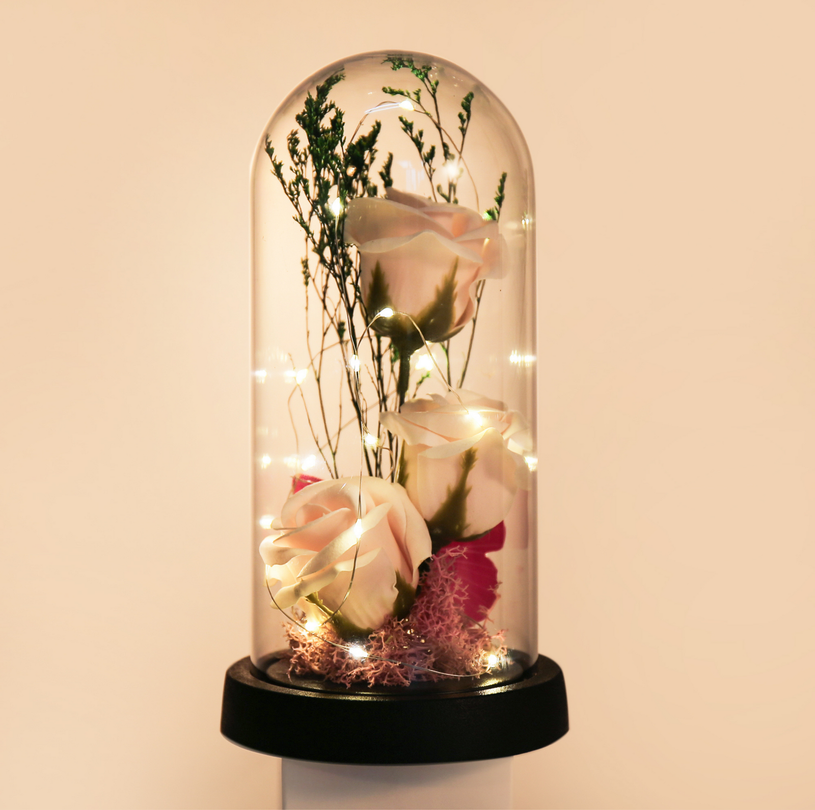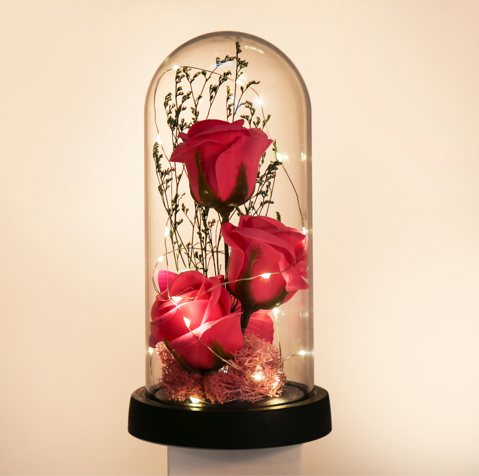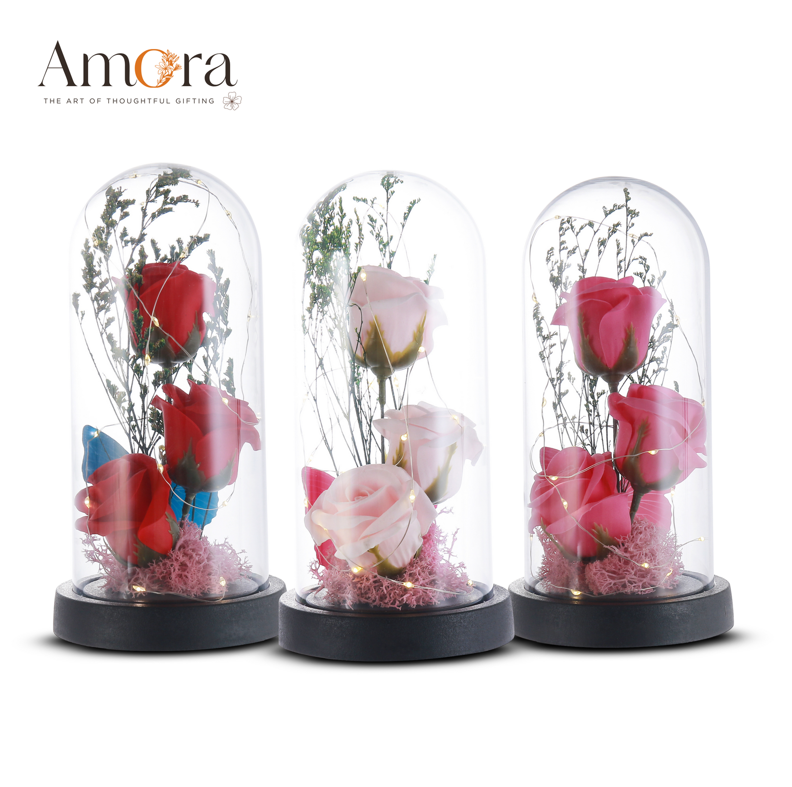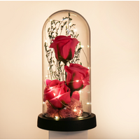 Bring elegance and charm into any space with the Trio of Love Acrylic Dome. Featuring three delicate roses illuminated by soft LED string lights, this piece creates a warm and romantic ambiance, making it a perfect decorative gift or keepsake.