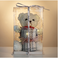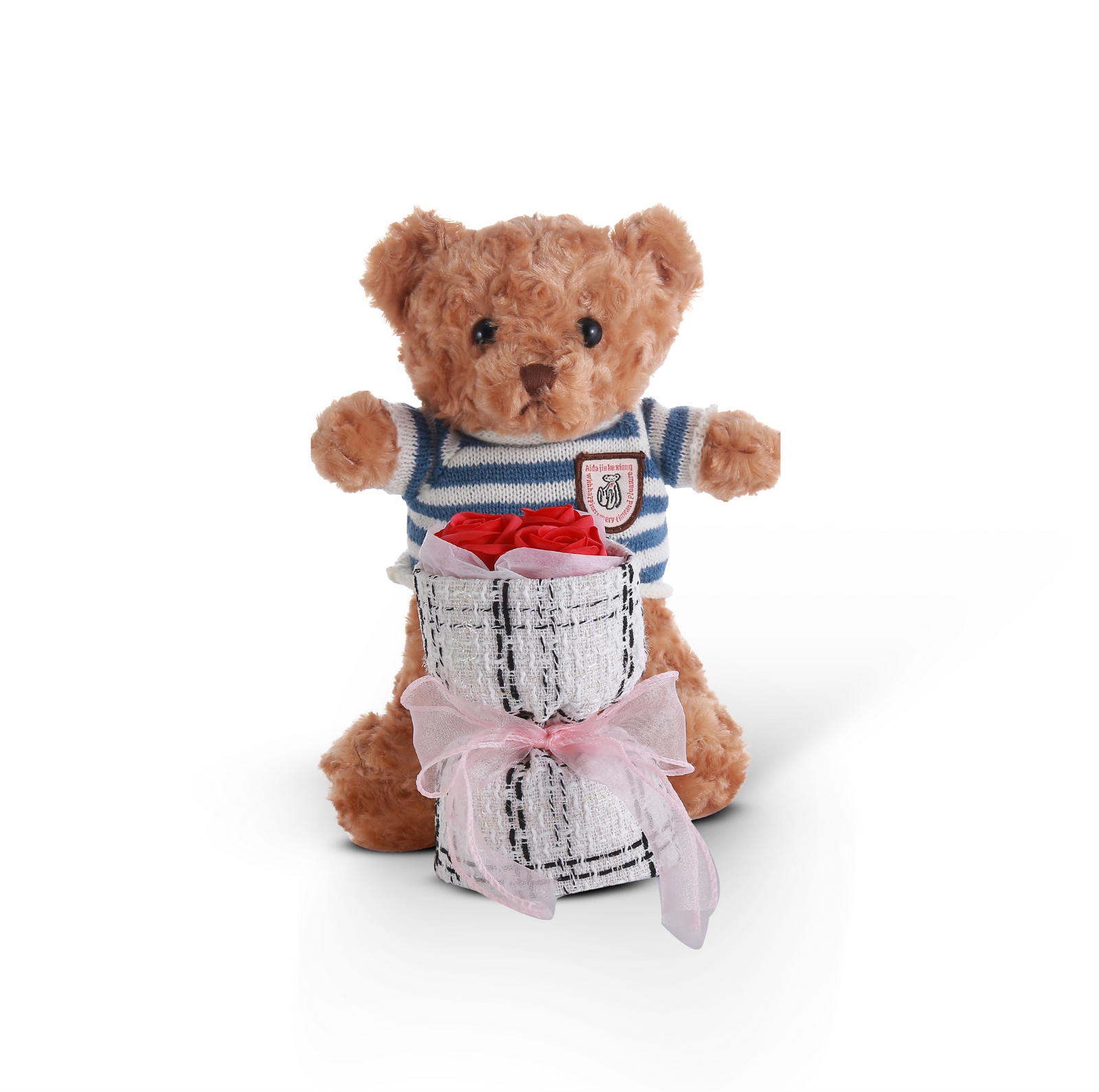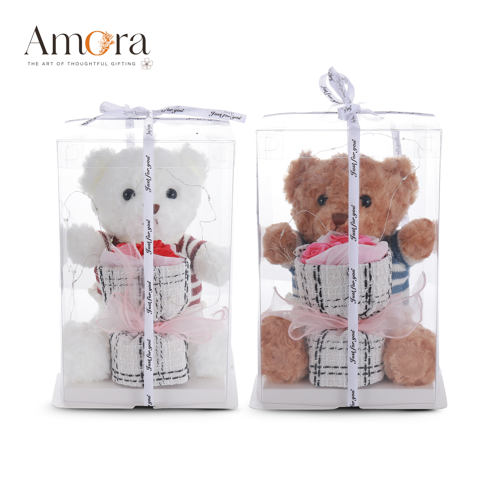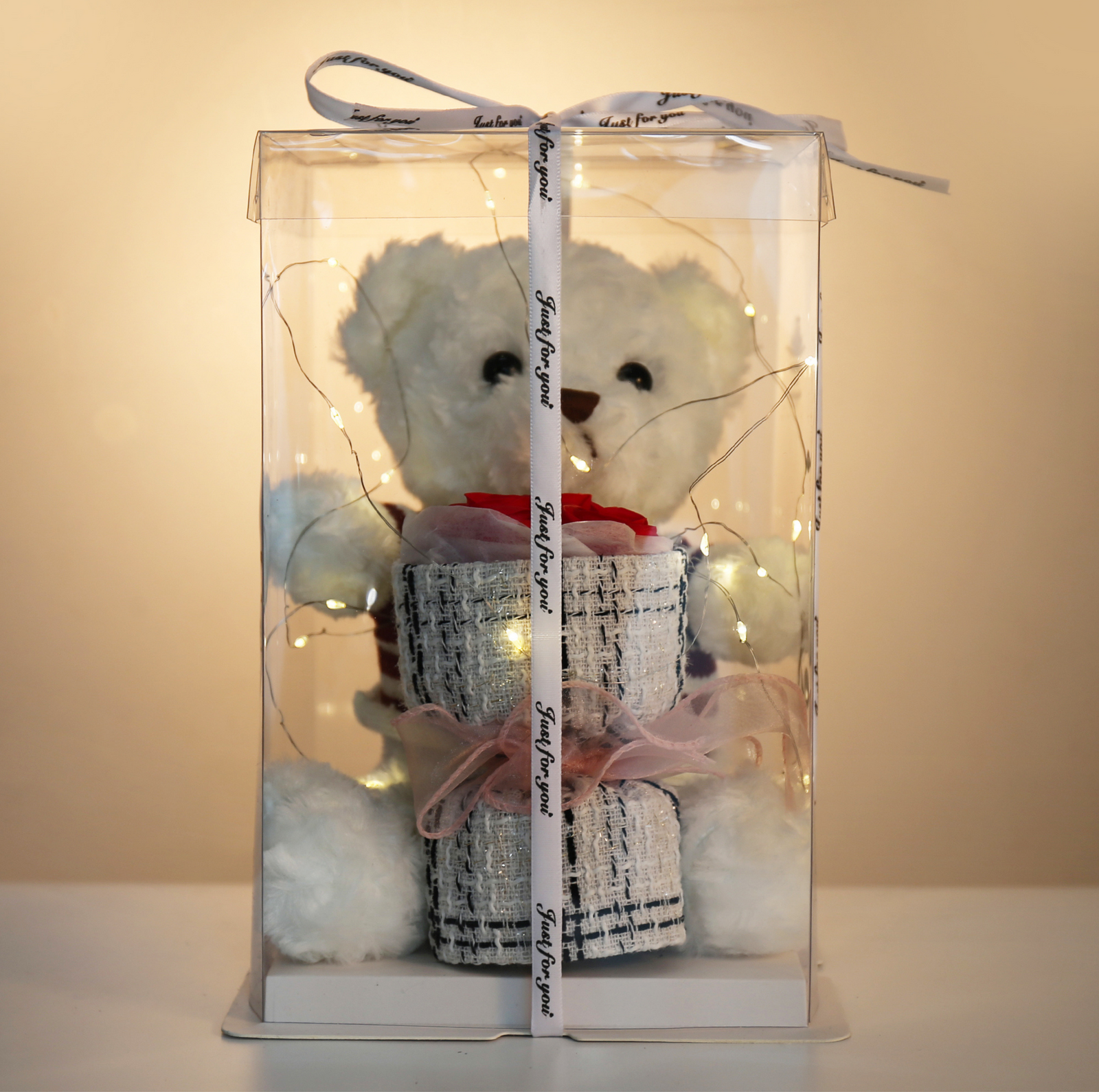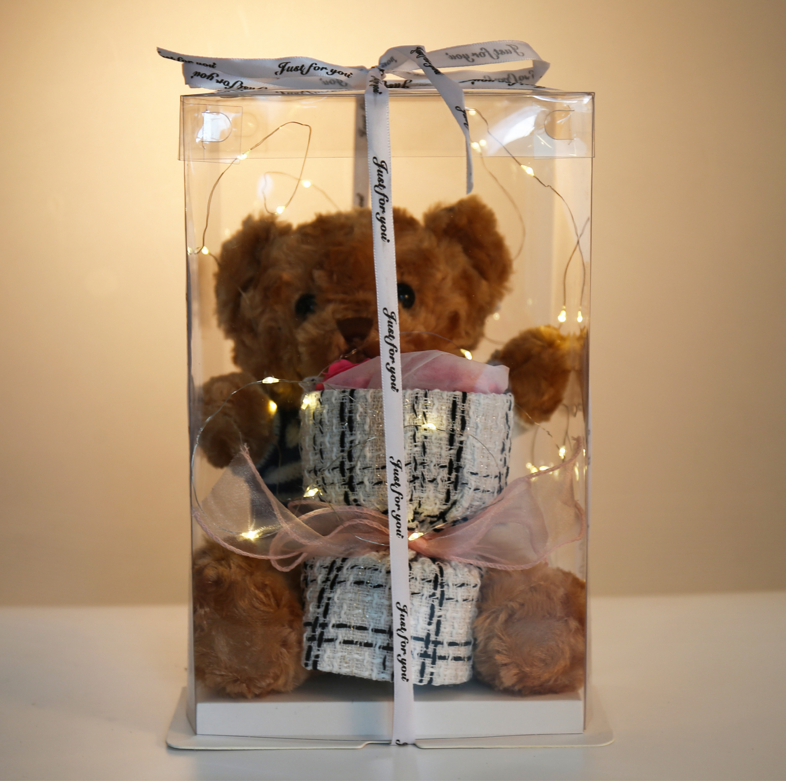 • Packaging – Clear box packaging that showcases the teddy and bouquet beautifully while making it easy to present as a gift.