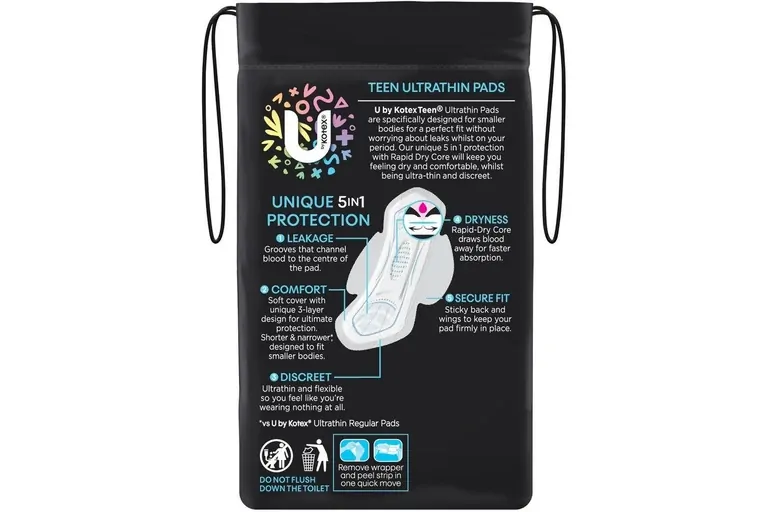 U by Kotex Teen Ultrathin Regular Pads are specifically designed for smaller bodies for a perfect fit without worrying about leaks whilst on your period. Our unique 5 in 1 protection with Rapid Dry Core will keep you feeling dry and comfortable, whilst being ultra-thin and discreet.
